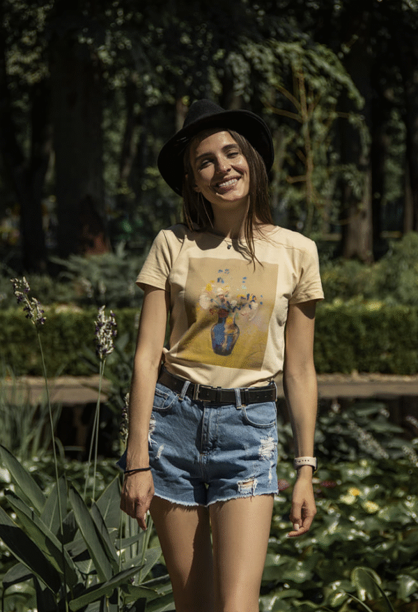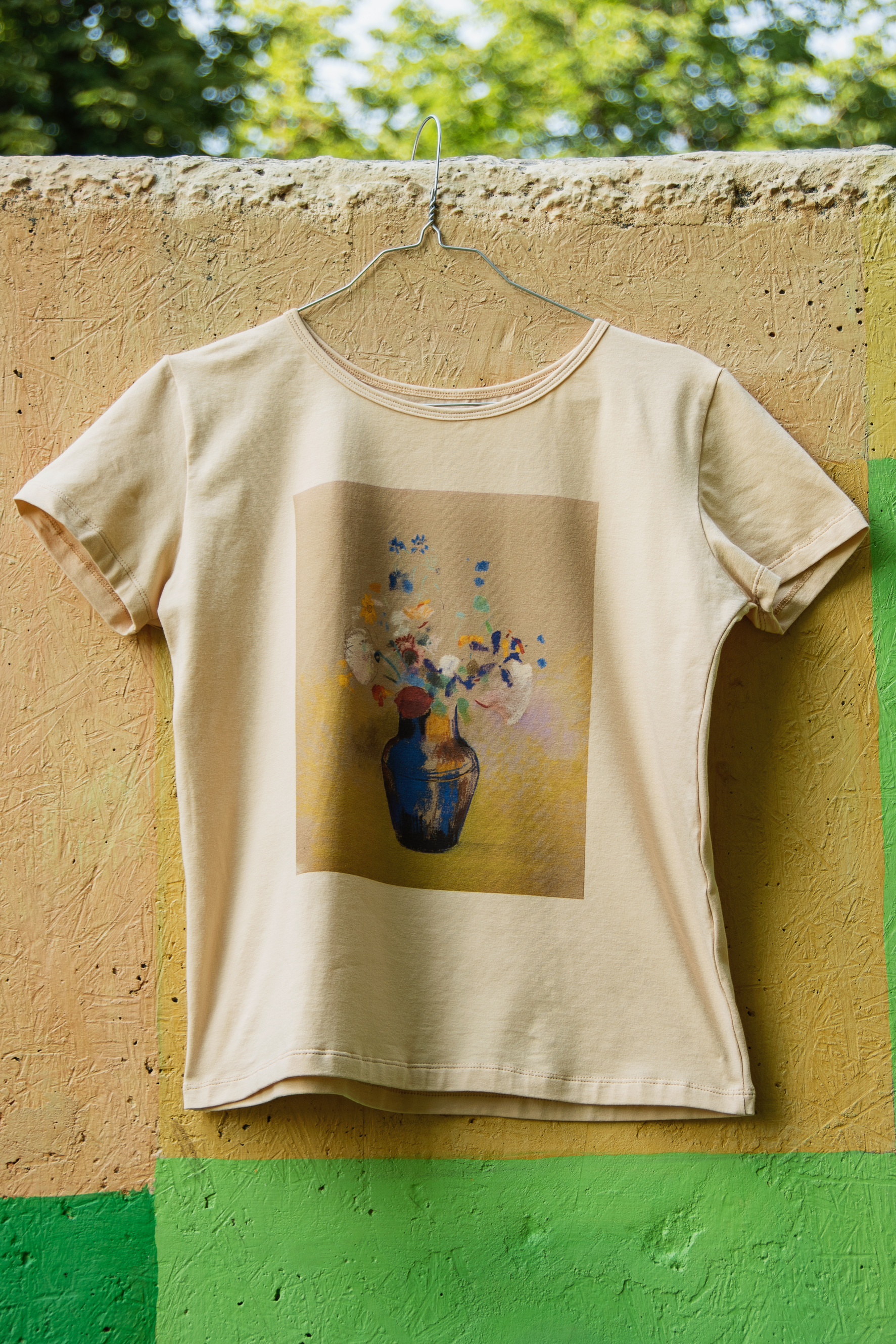 Trendy Beige (camel) UNISEX T-shirt with unique ‘Vase of Flowers’ art print by Odilon Redon, a French symbolist painter, printmaker, draughtsman and pastellist (1840-1916 years).