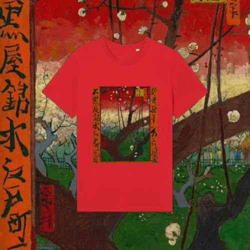 Do you know that Vincent was a big admirer of Japanese art that from his words “made him happy and cheerful”? I wanted to create a Japanese art printed t-shirt and red colour came first to my mind, as bright as Japanese culture and art. ‘Flowering Plum Tree’ by Vincent van Gogh is one of the best representations of the Japanese prints in red colour.